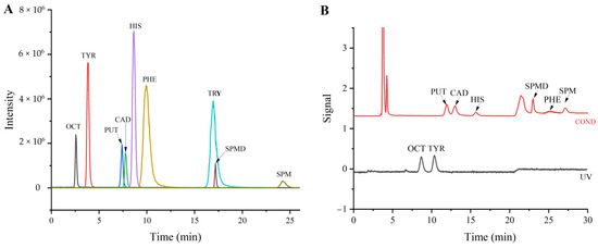 During method development, the first thing to consider was the compatibility of IC separation and the MS detector. Usually, suppression is necessary for IC before using the MS detector if nonvolatile acid is used as the eluent. However, in this case, tyramine cannot be detected because it is removed by the suppressor [30]. In order to simultaneously determine common BAs, non-suppressed detection was used with a more volatile formic acid as the eluent in this study. The most used analytical column IonPac CS17 for the separation of BAs was initially tested. Because of the weaker elution power of formic acid compared with HCl, H2SO4 and methanesulfonic acid, some BAs were hardly eluted even with high concentrations of formic acid in the eluent. In order to obtain rapid analysis times, only the short CG17 guard column was used for the separation. The separation of nine BAs was achieved using a gradient elution of formic acid solution. The direct injection of the individual standard solution (1 mg/L) of each BA was performed to optimize mass conditions. Mass scans were carried out in the positive ion mode. After confirming the Q1 mass, two characteristic ion pairs were selected as qualitative and quantitative ions for each BA using a Q3 mass scan. Ionization conditions and collision energy were optimized for the best sensitivity (Table 1). A typical separation chromatogram for the mixed standard solution of nine BAs by MS/MS detection is shown in Figure 1A. All BAs were separated in 25 min. Even with the optimized elution program, there was still some peak overlapping for the partial co-elution of PUT and CAD and the complete co-elution of TRY and SPMD. However, the accurate quantification of the individual BA was obtained by using separate MRM fragments with the MS/MS detection system. Meanwhile, IC with suppressed conductivity and UV detection was used for comparisons. It was clearly shown that six BAs (PUT, CAD, HIS, PHE, SPMD and SPM) were detected using conductivity detection, and OCT and TYR were detected by UV detection, while TRY could not be detected by both conductivity and UV detection. The response signals of the BAs detected by conductivity and UV were much lower than those obtained by MS/MS detection (except SPM). The main reason for the low response signal of SPM by MS/MS was that the high concentration of formic acid (1 M) for the SPM elution suppressed ionization and reduced sensitivity.