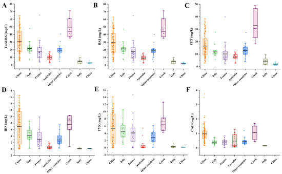 In red wine, PUT, HIS, TYR and CAD were the most abundant BAs, with detection frequencies of 100%, 100%, 100% and 97%, respectively, for all samples. PUT was present within a content range between 2.23 and 39.77 mg/L, followed by HIS at 0.04−16.54 mg/L, TYR at 0.02−14.67 mg/L and CAD at LOQ−3.75 mg/L. The levels of PHE in 213 samples ranged from LOQ to 6.29 mg/L with a detection frequency of 99%, from LOQ to 0.21 mg/L for OCT with a detection frequency of 55%, from LOQ to 5.30 mg/L for SPMD with a detection frequency of 59% and from LOQ to 0.019 mg/L for TRY with a detection frequency of 1%. SPM was below the LOQ in any red wine sample. As shown in Figure 2C, PUT, which is associated with poor sanitary conditions, showed the highest content levels among nine BAs, and the trend of PUT levels in the red wine samples of different geographical origins was similar to that of the total BAs. PUT was found to fall within the range of 2.83−38.42 mg/L (average 16.44 mg/L) in the red wine samples produced in China, followed by Italy (5.36−27.60 mg/L, average 12.31 mg/L), France (2.23−39.77 mg/L, average 10.13 mg/L), Australia (2.71−11.71 mg/L, average 7.59 mg/L) and other countries (3.90−27.28 mg/L, average 12.79 mg/L). HIS is considered one of the most toxicologically relevant BAs in foods, and its levels in red wine produced in Australia (3.90−27.28 mg/L, average 12.79 mg/L) were lower than those from the other countries (Figure 2D). The distribution of TYR in the red wine samples of different geographical origins was similar to that of HIS (Figure 2E). Compared with PUT, HIS and TYR, the content levels of CAD were lower, and the average contents of CAD in red wine from different countries were not statistically significant from each other, with the exception of China (Figure 2F).