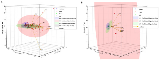 PCA biplot of red wine (A) and white wine (B) of different geographical origins.