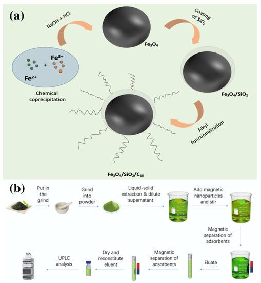 (a) Synthesis of C18/MNPs; (b) Protocol for the analysis of the tea powder using the proposed method.