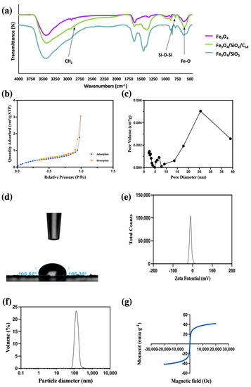 Characterizations of the magnetic C18/MNPs (a) Fourier transform infrared spectra; (b) Adsorption and desorption of nitrogen isotherms; (c) Pore distribution; (d) Static contact angle image; (e) Zeta-potential; (f) Particle size distribution; (g) Hysteresis loop.
