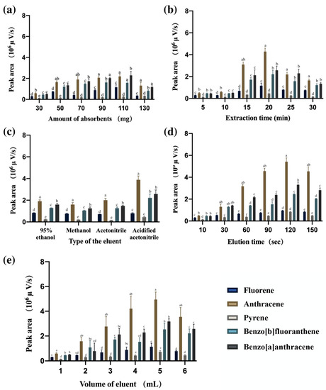 Next, the volume of eluent had a certain effect. The desorption solvent volume effect was investigated by varying the solution volume from 1 mL to 6 mL. As can be seen from Figure 3e, the peak areas of PAHs increased with the increase in desorption solvent volume and reached a plateau at 5 mL. The optimal solvent volume should be able to eluate the analytes from the adsorbents within a relatively small consumption of the solvent. Therefore, 5 mL was set as the optimum volume [36].
