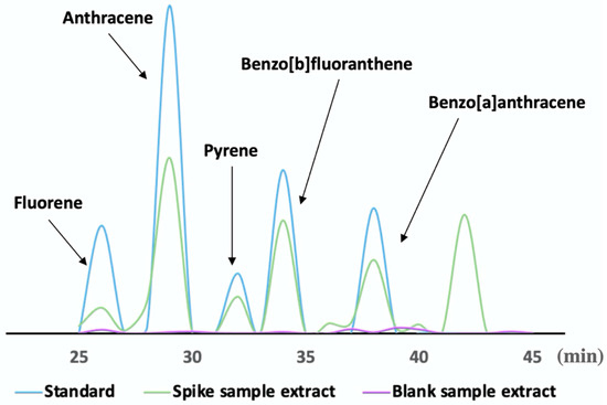 The proposed methodology helped the acquisition of PAH calibration curves for different concentrations of tea samples (0.5, 1, 5, 10, 20, 30, 50, 100, 200, and 300 ng g−1). Figure 4 shows PAHs mixed standard solution (300 ng mL−1), spiked sample extract (300 ng g−1), and blank sample extract of the chromatographic results. The calibration curves of five PAHs were obtained using the optimal extraction conditions. Table 2 summarized that the R2 of all calibration curves was greater than 0.997 within the linear range of the analytes, reflecting the result that the method was accurate enough to be suitable for quantitative purposes. The method was further proof of the feasibility of the magnetic nanoparticle enrichment of PAHs in tea samples, which had proven to be more sensitive than traditional methods. When the limits of detection (LODs) and limits of quantification (LOQs) were determined at their lowest concentrations is the point at which the five PAHs can be detected at signal-to-noise ratios above 3 and 10. To draw the proposed method’s accurate LOD and LOQ values, each analyte sample took ten times analysis.