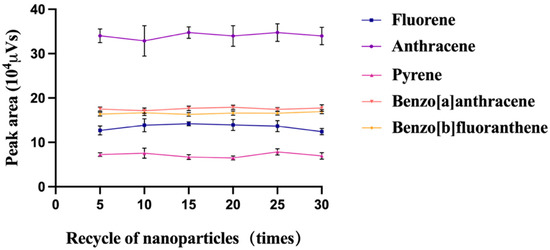 After repeating the experiment, the relationship between the UPLC signal of the spiked tea powder extract and the reuse time was displayed in Figure 5. The results suggested that the extraction effectiveness of nanoparticles had no significant change during the repeating extraction procedure, indicating the nanoparticles had good stability and durability. Peak areas of PAHs had RSDs by 8.4% for Fluorene, 5.8% for Anthracene, 10.8% for Pyrene, 3.0% for Benzo[a]anthracene and 2.7% for Benzo[b]fluoranthene, respectively. Thus, it was proved that the recyclability of C18/MNPs was great. Compared to those traditional methods using disposable adsorbents, recyclable magnetic nanoparticles can reduce environmental pollution and costs [37].