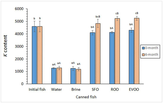 K content (mg·kg−1 dry muscle) in initial and canned fish muscle subjected to different previous storage and coating conditions. Average values of five replicates (n = 5); standard deviations are indicated by bars. For each frozen storage time, different lowercase letters (a–c) indicate significant differences (p < 0.05) between initial fish and each of the canned samples corresponding to the different coating conditions. For each coating condition, different capital letters (A, B) indicate significant differences (p < 0.05) as a result of the frozen storage period. Abbreviations as expressed in Table S1.