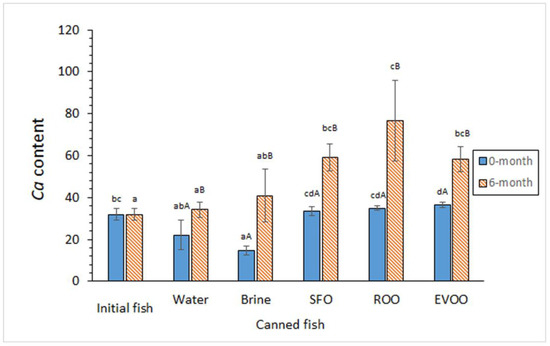 Ca content (mg·kg−1 dry muscle) in initial and canned fish muscle subjected to different previous storage and coating conditions. Average values of five replicates (n = 5); standard deviations are indicated by bars. For each frozen storage time, different lowercase letters (a–d) indicate significant differences (p < 0.05) between initial fish and each of the canned samples corresponding to the different coating conditions. For each coating condition, different capital letters (A, B) indicate significant differences (p < 0.05) as a result of the frozen storage period. Abbreviations as expressed in Table S1.