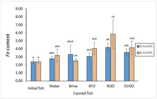 Comparison with initial fish revealed an average increase in Fe content in all canned samples (Figure 3); differences were found significant (p < 0.05) for oil-coated samples for Groups I and II. Comparison among coating systems showed that both olive oil systems led to the highest average Fe contents. For samples of Group I, differences between ROO-coated fish and aqueous- and SFO-coating systems were significant (p < 0.05). No significant differences (p > 0.05) were found as a result of the previous frozen storage; however, oil-coated samples corresponding to Group II led to higher average Fe values.