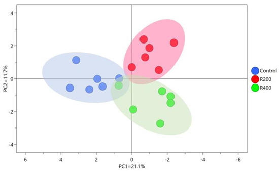 PLS-DA score plot of FA profile, based on the concentration of FAs in breast muscle of Qingyuan partridge chickens. Each point represents a replicate in the scatter plots. Control, R200, and R400 mean the groups supplemented with 0, 200, and 400 mg/kg rutin, respectively.