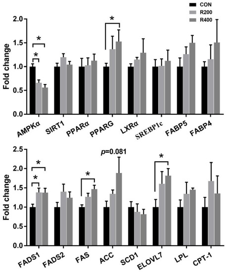 Effects of rutin supplementation on the relative expression of the genes associated with lipid metabolism in breast muscle of Qingyuan partridge chickens. Values are presented as the means ± SEM (n = 6). Asterisk means statistical significance between the treatment groups at α = 0.05 level. CON, R200, and R400 mean the groups supplemented with 0, 200, and 400 mg/kg rutin, respectively. ACC, acetyl-CoA carboxylase; AMPKα, adenosine monophosphate-activated protein kinase alpha; CPT-1, carnitine palmitoyltransferase-1; ELOVL7, long-chain fatty acid elongase 7; FABP4, fatty acid binding protein 4; FABP5, fatty acid binding protein 5; FADS1, fatty acid desaturase 1; FADS2, fatty acid desaturase 2; FAS, fatty acid synthase; LPL, lipoprotein lipase; LXRα, liver X receptor alpha; PPARα, peroxisome proliferator-activated receptor alpha; PPARG, peroxisome proliferator-activated receptor gamma; SCD1, stearyl coenzyme A decarboxylase 1; SIRT1, sirtuin 1; SREBP1c, sterol regulatory element binding protein 1c.