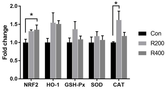 Effects of rutin supplementation on the relative expression of antioxidant-related genes in breast muscle of Qingyuan partridge chickens. Values are expressed as the means ± SEM (n = 6). Asterisk means statistical significance between the treatment groups at α = 0.05 level. Con, R200, and R400 mean the groups supplemented with 0, 200, and 400 mg/kg rutin, respectively. CAT, catalase; GSH-Px, glutathione peroxidase; HO-1, heme oxygenase-1; NRF2, nuclear factor erythroid 2-related factor 2; SOD, superoxide dismutase.