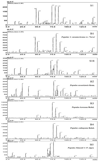 Figure 1 displays the HPLC profile of propolis sample S18 from the Yichun apiary, which differs significantly from sample S1. The 32 compounds in sample S18 were identified, including four characteristic compounds: pinobanksin, pinocembrin, pinobanksin-3-acetate, and chrysin (Figure 1 and Table 1). These four compounds made up approximately half of the total phenolic content. To determine the botanical source of S18, we collected bud resins from several species of Populus trees (Populus ussuriensis Kom., Populus koreana Rehd., Populus cathayana Rehd., and Populus Simonii × P. nigra) in the vicinity of the apiary. A comparison between sample S18 and the bud resins of these four Populus species revealed that the chromatogram of Populus Simonii × P. nigra (B5) was highly similar to that of S18 (Figure 1), while the chromatogram of S18 noticeably differed from those of bud resins of Populus ussuriensis Kom. (B2), Populus koreana Rehd. (B3), and Populus cathayana Rehd. (B4). Additionally, the similarities between S18 and the bud resins of Populus Simonii × P. nigra (B5) were found to be 0.966 (Supplement Table S5). Furthermore, the flavonoids/phenolics ratios of the bud resin of Populus Simonii × P. nigra (B5) and sample S18 accounted for about 50%. These results suggest that the botanical origin of S18 propolis sample is likely Populus Simonii × P. nigra.
