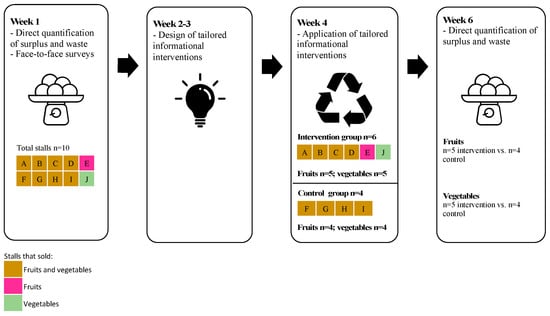Stalls were randomly assigned to an intervention or control group, verifying that the stalls of the control group were not physically adjacent to the stalls of the intervention group. Based on the results of the survey, we designed informational interventions to reduce surplus and waste tailored to the stalls of the intervention group. The informational interventions were delivered to the intervention group, whereas the control group had no intervention. Two weeks later, the quantification of surplus and waste was repeated in all stalls (“after” time point).