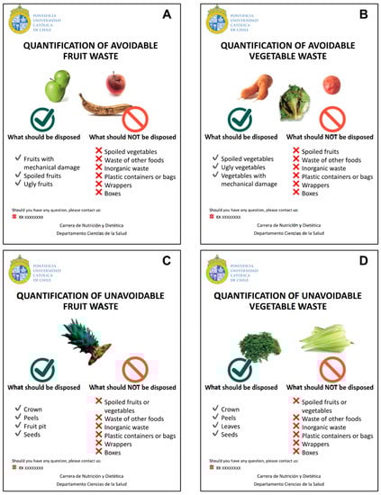 Each container had an infographic that detailed what should and should not be disposed of (Figure 2). Specifically, avoidable waste included deteriorated (e.g., mechanically damaged or spoiled) and “ugly” fruits and vegetables that were discarded; unavoidable waste included inedible parts of fruits and vegetables that were discarded (e.g., crown, fruit pit, leaves, and stems). This procedure was performed at the “before” and “after” time points. To minimize desirability bias, all research procedures were explained to the grocers emphasizing that fruit and vegetable wasting could be an inherent part of the process of selling the products.