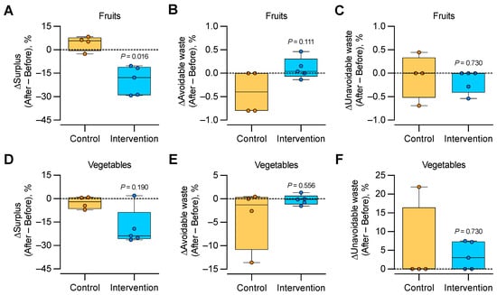 ΔSurplus, ΔAvoidable waste, and ΔUnavoidable waste of fruits (A–C) and vegetables (D–F) at stalls. Boxes represent the 25th and 75th percentiles, with a horizontal line denoting the median; whiskers denote the minimum and maximum values. Circles represent raw data points. Mann–Whitney U Test was used for comparison between groups.