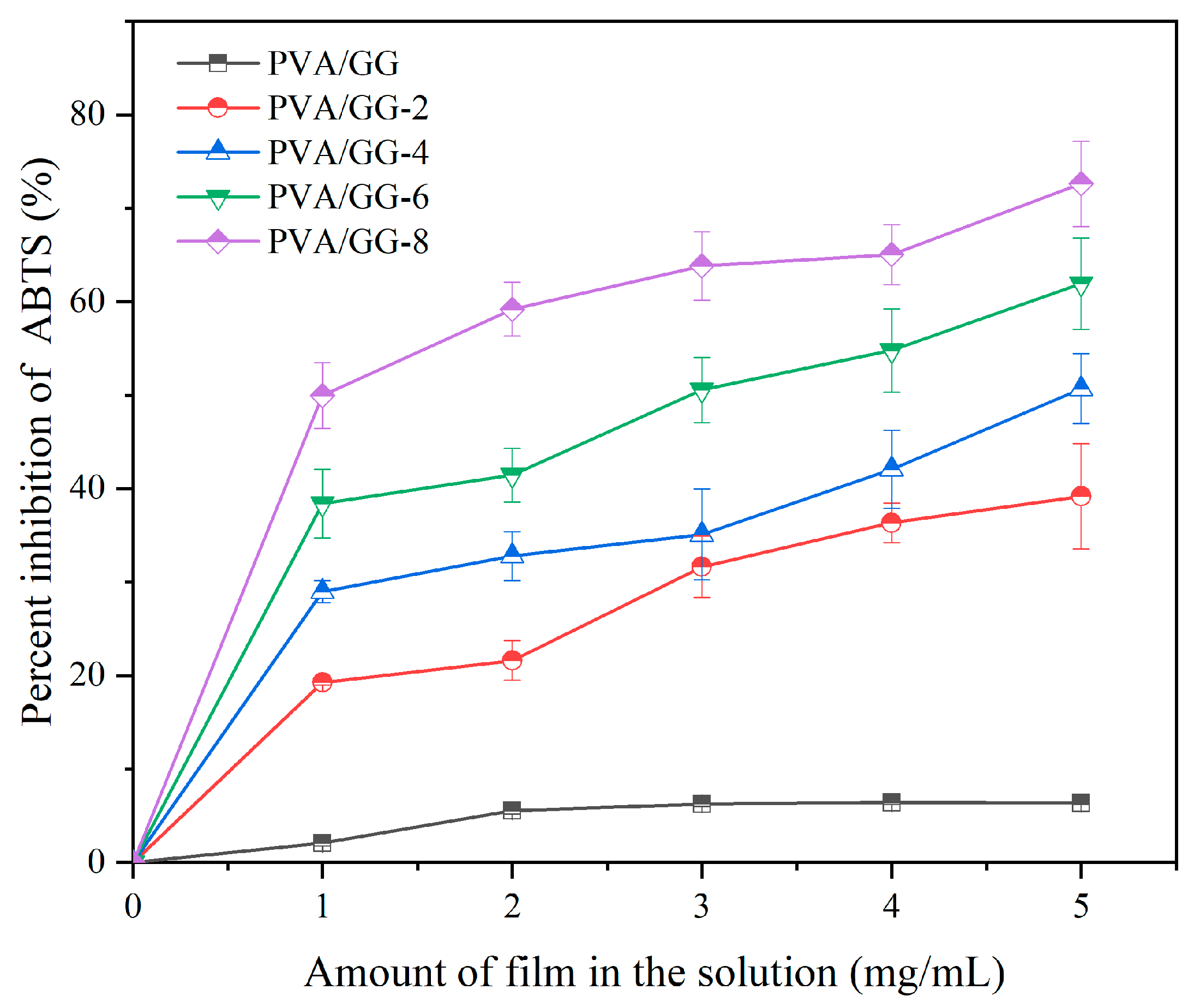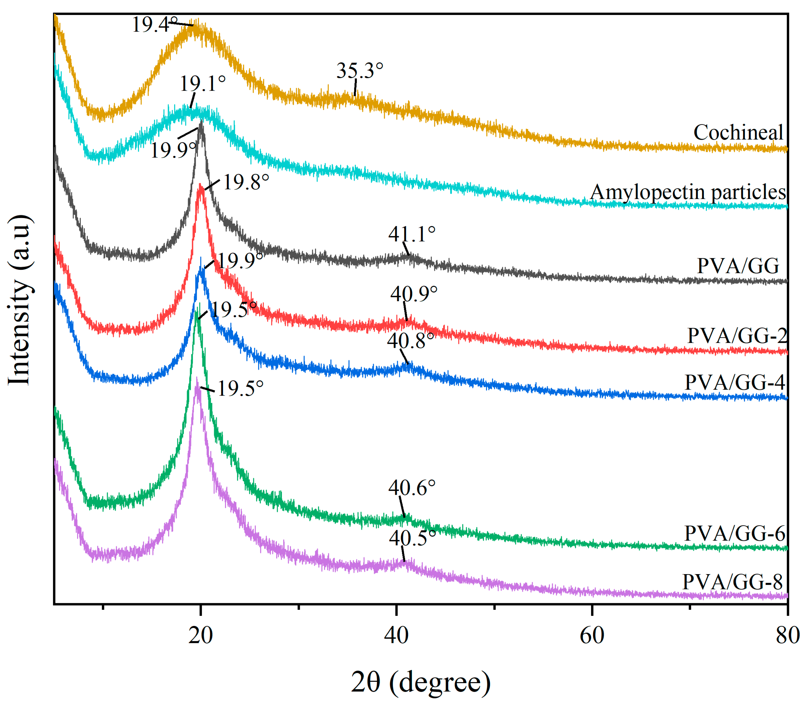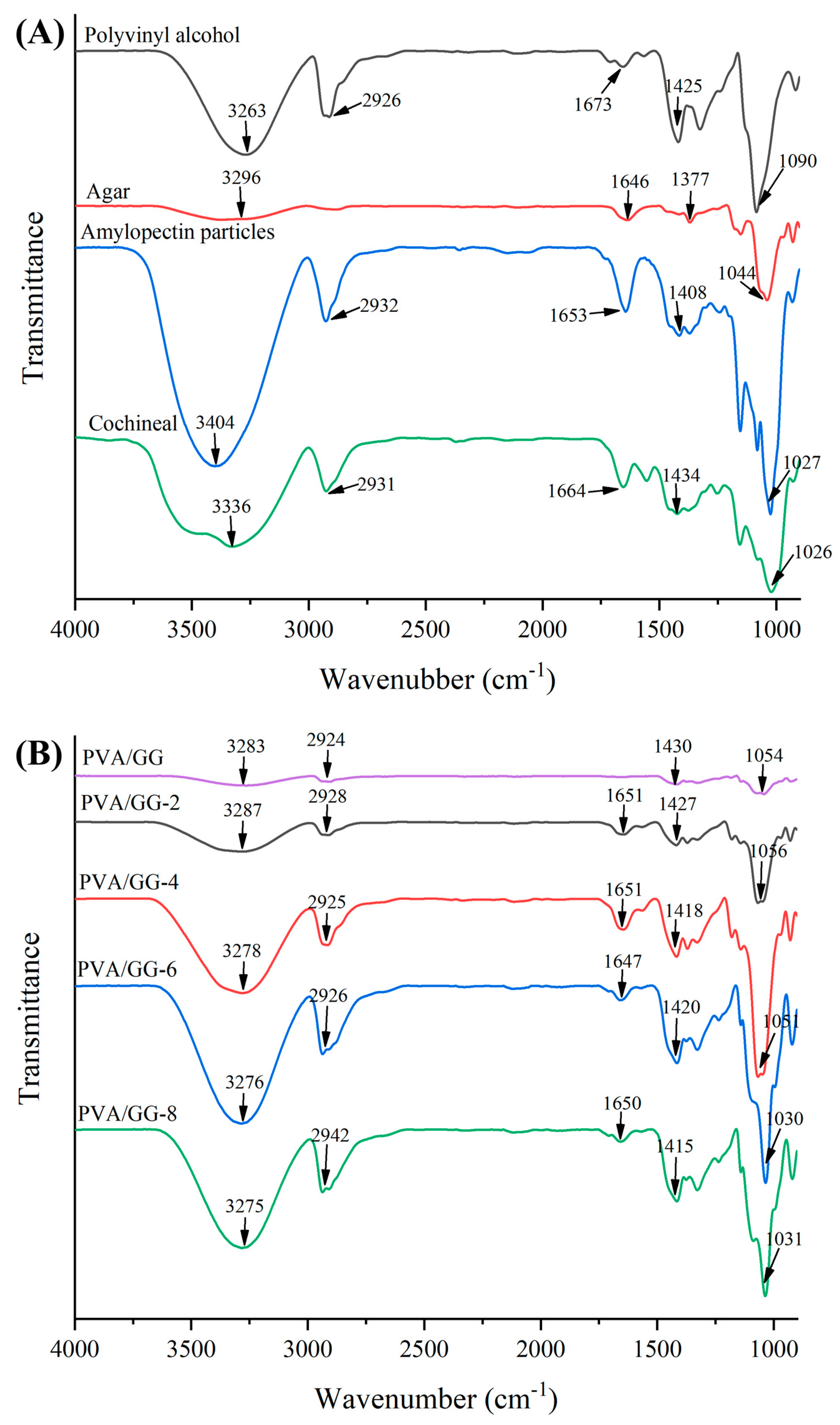 | Physical Properties | Cochineal | PVA/GG Film | PVA/GG-2 Film | PVA/GG-4 Film | PVA/GG-6 Film | PVA/GG-8 Film |