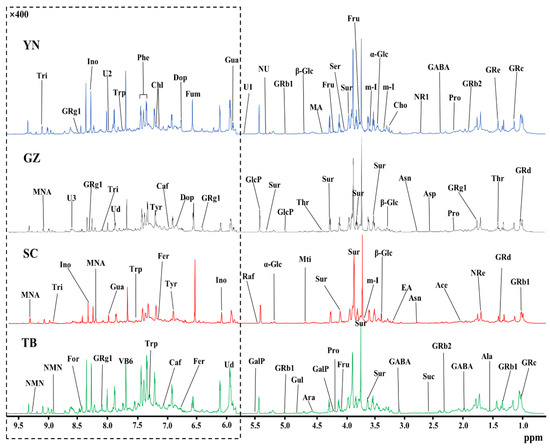 An 850 MHz 1H-NMR spectral comparison of P. notoginseng from four producing areas: Yunnan (YN); Guizhou (GZ); Sichuan (SC); and Tibet (TB). For clear observation, the spectral regions of δ6.0–9.5 were vertically magnified 400 times relative to the spectral regions of δ0.5–5.5. The keys and the details of the labeled spectral information of the components and the corresponding quantitative results in each producing area are summarized in Table 1.