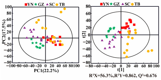 PCA (left) and PLS-DA (right) score plots of P. notoginseng from different producing areas. (YN: Yunnan; GZ: Guizhou; SC: Sichuan; TB: Tibet).