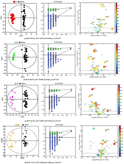 OPLS-DA score plots (left), 900-times permutation test plots (middle), and the corresponding volcano plots (right) derived from the NMR data of P. notoginseng from the different producing areas. (a) Yunnan vs. the three other producing areas; (b) Guizhou vs. the three other producing areas; (c) Sichuan vs. the three other producing areas; (d) Tibet vs. the remaining three producing areas. (YN: Yunnan; GZ: Guizhou; SC: Sichuan; TB: Tibet; Others: the other three producing areas).
