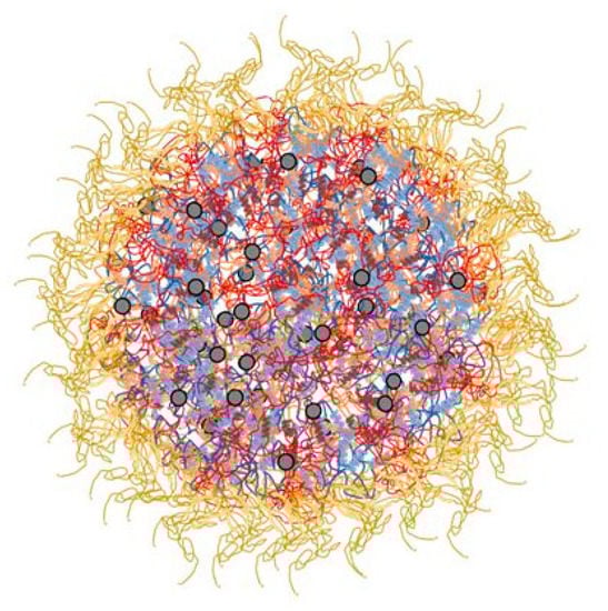 Casein micelle structure and its components: κ-casein (yellow); α-casein (blue); β-casein (red); calcium phosphate nanoclusters (grey dots).