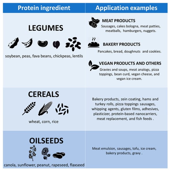 Plant proteins are characterized by a different structure and morphology than animal proteins, which highly influences their functionality []. During their evolution history, plants have developed the ability to biosynthesize a large number of proteins for different purposes and can be generally classified into two different groups: “metabolic” and “storage” proteins. The first ones represent crucial proteins for the development of the plant, while the second ones consist of the reservoir of vital amino acids to sustain plant life []. These groups represent an important nutritional source for both humans and livestock or animal feed thanks to the presence of essential amino acids which can satisfy their nutritional requirements [,]. Plant proteins are generally obtained by dry or wet extraction methods as co- or by-products from various starting materials of the oil and starch extraction industries. More than 30 plant protein sources are currently used in food formulation, and overall, they can be organized into three general groups: legumes, cereals, and oilseeds [] (Figure 2). Among the legumes, soybean and green peas are the most employed nowadays, but also proteins from other beans such as fava beans, chickpeas, and lentils are commonly requested by the food industry [,]. Regarding the cereals group, the main sources of proteins are provided by wheat gluten, corn zein, and rice, while proteins from oilseeds are separated from the oil, starch, and fibers of products such as canola, sunflower, peanut, rapeseed, and flaxseed [,,,].