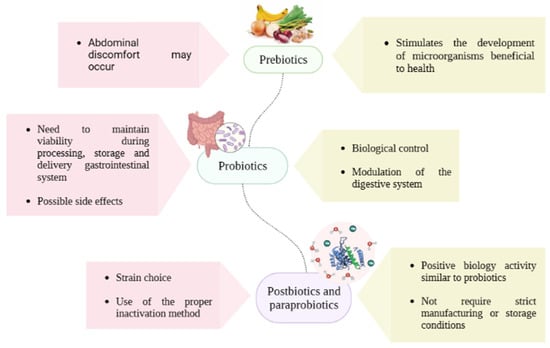 Paraprobiotics are inactivated microbial intact (nonviable) cells, previously referred to in the literature as “inactivated probiotics” and phantom probiotics”, or cell fractions, which have completely lost their viability after exposure to factors that alter microbial cell structures, such as breakage strand DNA (Deoxyribonucleic acid), disruption of the cell membrane, or mechanical damage to the cell envelope, but which conferred benefits on the consumer’s health [7]. Postbiotics, on the other hand, are soluble factors, such as metabolic products or by-products secreted by live bacteria or released after bacterial lysis, that can offer a positive effect on the consumer [8]. These components have production advantages over probiotics since cell viability is not required. Therefore, it makes technological development and application in food more favorable.