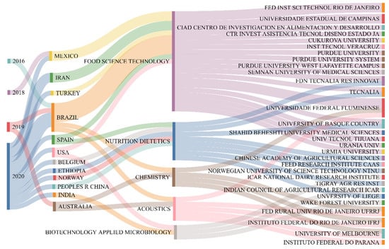 The bibliometric analysis that identifies countries/regions, affiliations, and areas of publications of authors and co-authors allows performance analysis of the current production. Furthermore, with advances in communication technology, people from many nations and continents can now collaborate on research projects more easily, which allows for the cross-border transfer of knowledge and technologies [17]. The correlation between the year of publication, the authors’ countries, research area, and the authors’ affiliation with the most cited documents was performed using the Sankey diagram (Figure 2). Brazil appears in the Sankey diagram as the country with the most cited scientific productions in terms of postbiotics and paraprobiotics, whose publications took place in 2016 and 2020, mainly in food science technology, chemistry, and science of sound phenomena. Brazil, Mexico, Iran, Spain, and Turkey are the leading nations with the most relevant publications in food science technology. In this area of research, the significant influence of Brazilian institutions, such as the Universidade Federal Fluminense, Instituto Federal de Educação, Ciência e Tecnologia do Rio de Janeiro, and Universidade Estadual de Campinas are also noted. Other institutions, such as the Technological Research and Development Center—Tecnalia and the Fundación Tecnalia Research and Innovation, also stand out.