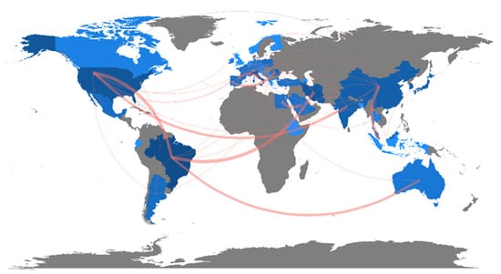 In chemistry and acoustics, the highlight is a 2019 study produced by authors from Brazil and Australia. The Sankey diagram (Figure 2) shows the relationship and collaboration between primarily Brazilian institutions, such as the already highlighted Universidade Federal Fluminense and the University of Melbourne in Australia. The most cited documents in biotechnology applied to microbiology are from America (USA) and India. In general, terms to better understand the geographic location and the main collaborations between the authors’ countries, a world map was prepared, where it is possible to observe the collaboration network between countries (Figure 3).