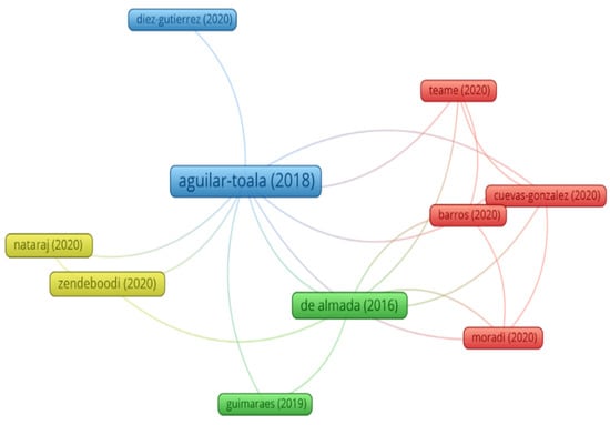 In Figure 5, we observe the network of collaborations between the most relevant authors researching the use and mechanism of action of paraprobiotics and postbiotics. When analyzing Figure 5, we notice the approximation of authors by the similarity of the field of study and how collaborations occur for the dissemination of scientific knowledge. The study of Aguilar-Toala et al. [23] approximates similarity to the review published by Diez-Gutiérrez et al. [28] in the Journal of Functional Foods, entitled “Gama-aminobutyric acid and probiotics: Multiple health benefits and their future in the global functional food and nutraceutical”. This review highlights the importance of gamma-aminobutyric acid produced by lactic acid bacteria since the imbalance of this neurotransmitter has been related to diseases of different etiologies, and the development of food products enriched with this amino acid can contribute to preventing and alleviating the symptomatology of these diseases.