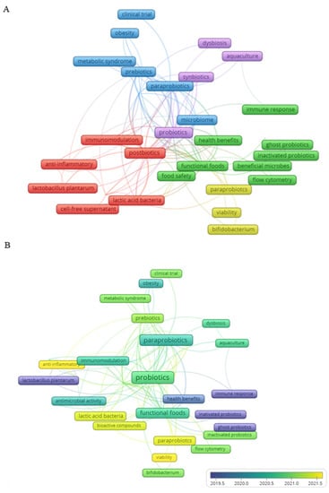In Figure 6, the similarity network of the authors’ keywords is visualized in the studies chosen for analysis. In general, it is noted that different terms are used to conceptualize the secondary metabolites produced in fermentation by probiotic bacteria and inactivated probiotic cells, as is the case with the terms “ghost probiotics” and “inactivated probiotics”. The definition and conceptualization of terms for global use in the study of these products of lactic acid bacteria beneficial to health are one of the main discussions presented by the scientific community in this area, always noting the need for a previous definition in each study. In terms of theme, in Figure 6A, we identified the formation of five clusters.