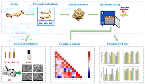 The drying test was carried out in a far-infrared drying oven. Before the test, the equipment was adjusted to the preset parameters (drying power 900 W, temperature 50 °C) for preheating. After ultrasonic pretreatment, the samples were drained from the surface, sliced, weighed (120.0 ± 0.5) in a single layer, placed on trays, and dried in the far-infrared drying equipment (the optimal process for the far-infrared drying of licorice was obtained from the pre-test at a drying temperature of 50 °C and a slice thickness of 4 mm, so these were set as the fixed drying parameters). During the drying process, the sample trays were removed every 20 min, weighed on a digital balance with an accuracy of ±0.001 g (AUW-220D, Shimadzu, Japan), and then placed back in the drying oven to continue drying until the moisture content of the sample decreased by less than 12% []. Each group of tests was repeated three times, and the average value was taken as the test value. To verify the result of pretreatment on the of far-infrared drying effect on licorice, far-infrared dried licorice without ultrasonic pretreatment was selected as a control group for comparison. The experimental procedure is shown in Figure 1.