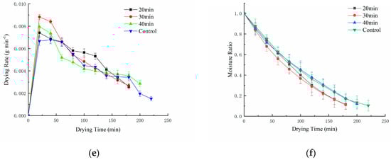 The drying rate curve was analyzed. Under different drying conditions, the drying rate of each sample reached the maximum at about 20 min, and then decreased continuously. On the one hand, this is because the moisture content of the material is continuously reduced, which greatly increases the diffusion resistance of water in the sample; on the other hand, the attenuation coefficient of ultrasonic wave propagation in the material will increase with the decrease in the dry basis moisture content of the material, the mechanical effect and cavitation effect will be weakened, and the ultrasonic strengthening effect is not obvious [].
