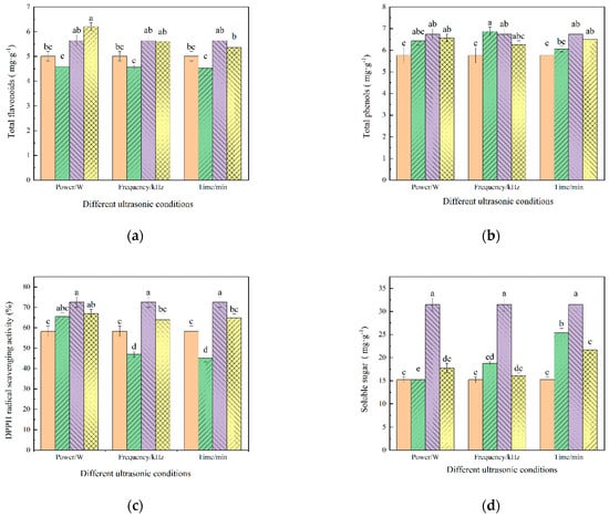 (a) Total flavonoids content; (b) total phenolic content; (c) DPPH radical scavenging activity; (d) Soluble sugar content. The total phenolic, antioxidant, soluble sugar, and total flavonoid content in licorice under different ultrasonic conditions. Control group (