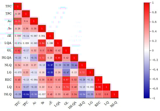 The correlation between the quality indexes of licorice slices is shown in the Figure 4. It can be seen that TFC is positively correlated with LQ, REC, NLQ, GL, ΔE, Ss, Ac, and TPC. The higher the TFC content, the greater the correlation with Ac (r = 0.75). Deng et al. also revealed that the antioxidant activity was positively correlated with TPC []. There was a significant positive correlation between REC and LQ (r = 0.96). TPC was negatively correlated with ISLQ (r = −0.84). Ss was positively correlated with LQA and ISLQA, and the correlation was significant (r = 0.84, r = 0.72). By observing the correlation between ΔE and each component, it was found that the index was negatively correlated with NLQ and LG, and positively correlated with other components. The positive correlation coefficient between LG and ISLQA was 0.95, and the correlation was extremely significant. On the whole, there is a significant correlation between pretreatment conditions and the quality indexes of licorice.