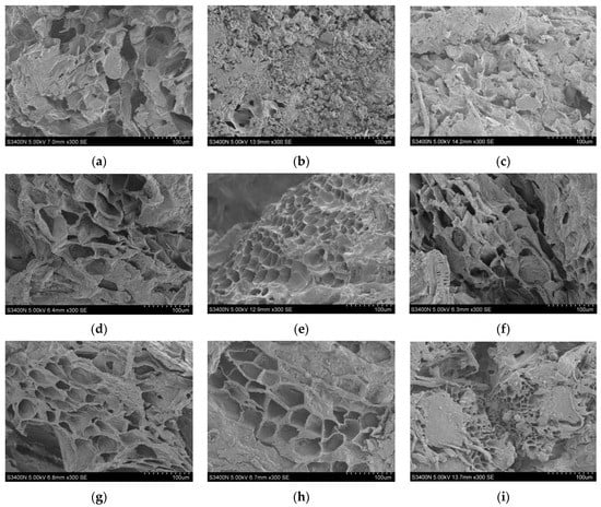 In the drying process, the microstructure of the material has an important influence on the heat and mass transfer and water diffusion characteristics []. The microstructure of the dried products dried under different ultrasonic pretreatment conditions is shown in Figure 5. It can be clearly seen that the licorice slice tissue will continue to shrink during the drying process, and the cavity will become smaller, while the cell tissue structure of the dried products resulting from natural drying (Figure 5a) without ultrasonic pretreatment (Figure 5b) is more compact and denser. When the ultrasonic frequency was 40 kHz and the treatment time was 30 min, the higher the ultrasonic power, the clearer the arrangement of the cell structure microchannels on the surface of the licorice slices (Figure 5c–e). When the ultrasonic power was 60 W and the time was 30 min, regardless of the frequency, the microchannel of the cell structure on the surface of the licorice slices showed little change, indicating that the ultrasonic frequency had an insignificant effect. When the ultrasonic power was 60 W and the frequency was 40 kHz, with the increase in ultrasonic action time, the structure of the material cells and the formed microchannels was gradually destroyed, and the tissue integrity of the cells was also reduced (Figure 5h,d,i). In addition, when the ultrasonic pretreatment power was 80 W and the frequency was 40 kHz for 30 min, the skeletal structure of the licorice slice cells remained in good condition, and the microchannel was clearly visible. Under this condition, the fiber network structure could be observed.