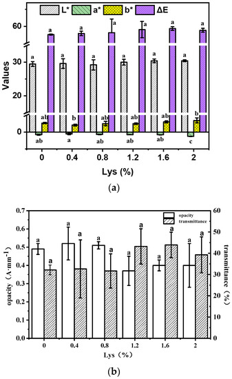 (a) Color parameters and (b) opacity and transmittance of antibacterial composite films incorporated with different concentrations of Lys (0–2.0%). Different letters indicate significant differences (p < 0.05).