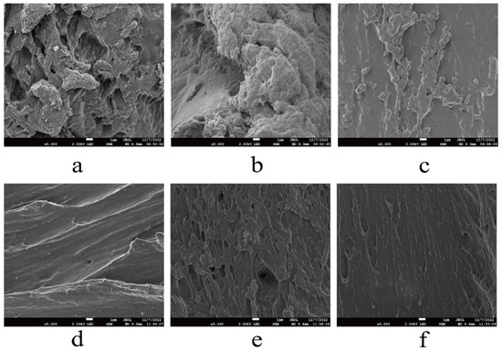 It has been reported that Lys, whose essence is protein, could be embedded into the macromolecular chain of EWP through protein–protein interactions, promoting the fluidity of the molecular chain and reducing the brittleness of EWP-based films [31]. Figure 2a–f represents scanning electron microscope images of EWP-Lys composite film with a concentration of Lys from 0% to 2.0% (w/w). It can be observed from Figure 2 that significant differences appeared in the cross-sectional structure and morphology of the composite films. With an increasing addition of Lys, the cross-section of the composite films gradually changed from “convolution” to “smoothness”, which could be interpreted as the decrease in intermolecular force between proteins through hydrogen bonds between Lys and EWP under high-speed rotation and relatively high temperature conditions [32,33]. In addition, with the increase in the amount of Lys, the degree of cross-linking between Lys and EWP increased, and the degree of convolution on the protein-based film further decreased. At the same time, it increased the tortuosity of water molecular inlet and outlet channels, which was one of the reasons why WVP decreased with the increase in Lys. It was found by Lan, Liu, Wang, Tian, Miao, Wang and Tang [34] that the morphology of lysine/starch/PVA film was denser than that of starch/PVA film. The hydroxyl groups of starch can form hydrogen bonds with the amino groups of Lys, forming a dense structure.