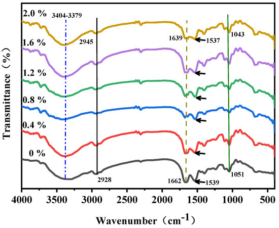 Intermolecular interactions and changes in protein structure within the film substrate can be studied at the molecular level. As reported, molecules of Lys have hydrophilic groups (amino acid residues) that can interact with the matrix components of EWP films [35,36]. To clarify the intermolecular interactions between Lys and EWP, FTIR spectra of EWP films prepared with glycerol and different percentages of Lys are depicted in Figure 3. The characteristic peaks of EWP mainly occurred at 3404 cm−1, 2945 cm−1, 1639 cm−1, 1537 cm−1 and 1043 cm−1, attributed to O–H and N–H stretching, C–H stretching, C=O stretching, N–H bending and C–O–C stretching vibrations, respectively [37,38,39]. After combining with Lys, no additional peaks of the films were observed, indicating that there was no covalent bond between EWP and Lys [40]. In other words, the interaction between the compounds is more likely due to physical reactions, and the degree of cross-linking between Lys and EWP is high enough. However, the O–H stretching vibration was depicted from 3379 cm−1 to 3404 cm−1 with the concentration of Lys increasing from 0% (w/w) to 2.0% (w/w), which might be attributed to the alteration of the stretching vibration in free O–H bands. In addition, C=O stretching was detected at 1662 cm−1 and slightly shifted to 1639 cm−1, while C–N stretching and N–H bending were observed shifting from 1539 cm−1 to 1537 cm−1 with the increasing addition of Lys. These phenomena were caused by C=O stretching and N–H bending in Lys in the film matrix [41]. Therefore, the spectral changes of EWP-based films should be due to alterations in the orientation and conformation of peptide chains with the incorporation of Lys.