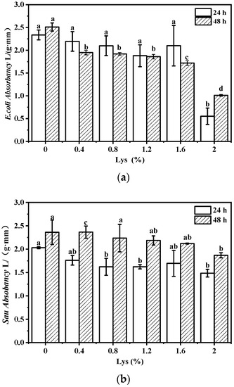 Figure 4 shows the growth of Escherichia coli (E. coli, Figure 4a) and Staphylococcus aureus (Sau., Figure 4b) at 24 h and 48 h (represented by changes in absorbance values) after adding the antibacterial composite film with different concentrations of Lys to the liquid medium. It can be seen from Figure 4 that when the concentration of Lys reaches 2.0%, the absorbance is the lowest, and the bacteriostatic effect is the best. In addition, a stronger inhibitory effect on E. coli was exhibited in Figure 4a, supporting the broad-spectrum antibacterial activity of Lys [42]. The addition of Lys indeed improves the antibacterial activity of the composite film and also proves that the EWP-Lys film has a good antibacterial application prospect. The possible bacteriostatic mechanism of Lys lies in the destruction of the structure of the cell membrane of microorganisms, leading to the separation of cell walls and cytoplasm, cell collapse or cytoplasmic overflow [43,44]. Secondly, the normal physiological metabolism of bacteria could be disrupted, causing disruptions in cell material, energy and information transmission [45,46]. Thirdly, Lys can interact with internal substances in cells to destroy the cell core, resulting in the overflow of ultraviolet absorbents and ultimately leading to the death of the cell [47]. However, in-depth studies should be conducted for more information to determine the exact bacteriostatic mechanism of the composite films.