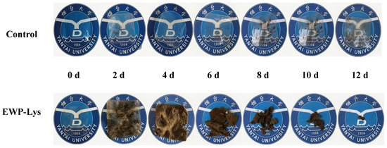 The biodegradability of the EWP-Lys composite film with the traditional plastic (polyethylene, PE) film as a control group is shown in Figure 5. Both groups were buried in the soil for several days, and the degradation within 12 days was observed and compared. The results showed that no signs of degradation could be seen within 12 days for the control group, while the EWP-Lys composite film exhibited degradation phenomena starting from the 4th day with wrinkles and structural defects. As time increased, the EWP-Lys group gradually fractured and lost and degraded into fragments of the size of soybean seeds by the 12th day. However, the size and morphology of the control group did not change at all. Therefore, the biodegradability of EWP-Lys films is high enough, and it is estimated that it will take about two weeks for completely degradation. The excellent degradation of EWP-Lys composite film provides great potential for its subsequent practical application, without any concern about environmental damage [48].