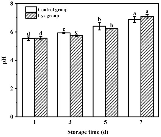 Changes in the pH value of the chilled meat wrapped in polyethylene plastic film (control group) and the composite film (Lys group, with 1.2 wt% Lys) during storage (mean ± standard error). Different letters indicate significant differences (p < 0.05).