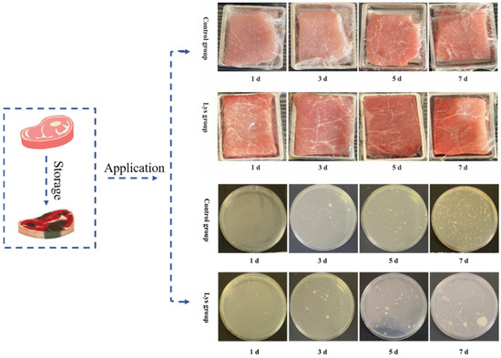 Cold fresh meat is susceptible to microbial contamination during storage [51]. Figure 7 shows the growth of microorganisms in chilled pork wrapped in PE film and EWP-Lys composite film during the storage period. It can be clearly seen from the figure that there is a slight growth of microorganisms in the Lys group at the initial stage of storage, which is consistent with the measurement results of indicators such as the pH of chilled pork. With the increase in storage time, the microbial growth of the Lys group was significantly lower than that of the control group (PE film) after 3 days (Table 3). Lys in the composite films played an effective role in inhibiting microbial growth, which means that the bacteriostatic effect of Lys was initially effective. After the storage time was extended to 7 days, the microbial growth rate was still lower than that of the control group. This result can more intuitively demonstrate that the composite film can play a key role in the storage process of cold fresh meat.