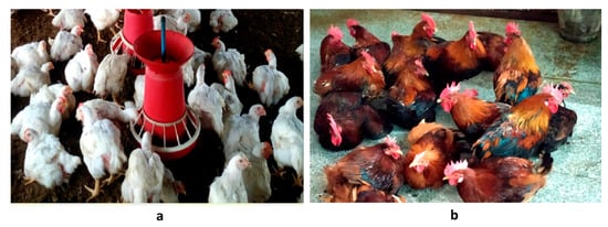 Chicken is the most consumed meat across the globe [1]. It is considered a healthy food due to its low energy value, reduced fat content, and higher proportion of polyunsaturated fatty acids [2]. Consequently, the commercial chicken production sector, which is largely based on the indoor rearing of fast-growing hybrid broiler chickens, has grown by leaps and bounds. A new trend in chicken meat consumption is in vogue, where consumers are demanding meat originating from a production system that ensures animal welfare, environmental responsibility, better sensory quality, and health benefits [3,4]. Therefore, free-range chicken production based on slow-growing strains is emerging as the upcoming segment of the contemporary poultry sector. The backyard poultry production system (BPPS) traditionally involves indigenous breeds adapted to free-range backyard conditions and is practiced by 80% of the world’s rural population [4]. The birds have negligible health care requirements, very high broodiness efficiency, and the ability to adapt to adverse environments as well as to defend themselves against predators [5]. However, the mortality rates of the chicks are high due to diseases, predation, malnutrition, and climate adversity [6]. Their meat has the preferred sensory attributes as it is darker, firmer, and more strongly flavored than the meat of commercial broilers [7]. The expectation of health benefits fetches a better price for the meat [8]. Hence, the BPPS plays a pivotal role in the food, nutritional, and financial security of rural people.