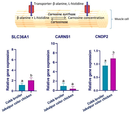 Relative mRNA abundance of SLC36A1, CARNS1, and CNDP2 genes in the breast meat of Cobb broiler and Jabalpur color chicken. Error bars represent the standard deviations from triplicate qRT-PCR runs. Different letters denote significant difference (p ≤ 0.05).