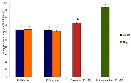 The high efficiencyof the BSA–MGO (bovine serum albumin–methylglyoxal) system selected for measuring the antiglycation potential was confirmed by the 94.39 ± 2.32% AGE inhibition recorded with the positive control (30 mM aminoguanidine). The JBC and Cobb broiler meat extracts also depicted the ability to inhibit the formation of fluorescent AGEs (Figure 3). They had a high antiglycation potential (>60%) since the corresponding value with pure carnosine was 72.57 ± 2.12. Breast and thigh tissue were equally potent in inhibiting the AGEs in both genetic groups (JBC and Cobb) as the percentage inhibition of the AGEs was 62.68 ± 0.86 and 61.66 ± 0.87 for the JBC breast and thigh meat, respectively. Similarly, the Cobb breast and thigh meat inhibited the AGEs by 63.43 ± 0.89 and 63.91 ± 0.98 percent, respectively.