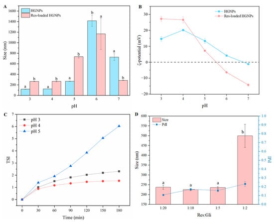 Effect of the pH on particle sizes (A) and ζ-potential (B) of hollow gliadin nanoparticles (HGNPs) and resveratrol-loaded hollow gliadin nanoparticles (Res-loaded HGNPs). At the same pH, different letters indicate significant differences (p < 0.05); (C) The TSI of Res-loaded HGNPs at a different pH; (D) Particle sizes of Res-loaded HGNPs at different ratios of gliadin to resveratrol (w/w). Different letters indicate significant differences (p < 0.05).