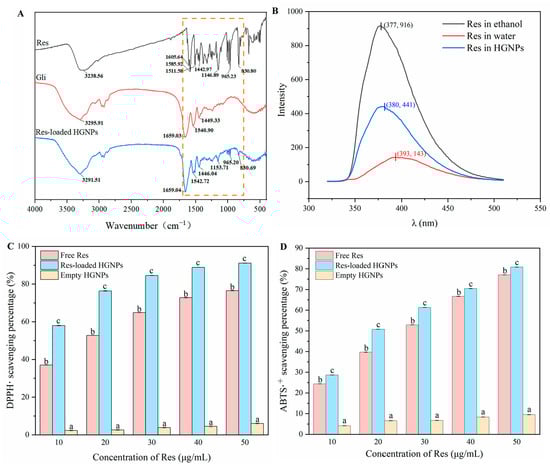 FTIR spectra (A) of resveratrol (Res), gliadin, Res-loaded hollow gliadin nanoparticles (Res-loaded HGNPs); (B) Fluorescence emission spectra of Res in water, ethanol and HGNPs; DPPH• scavenging capacity (C) and ABTS•+ scavenging capacity (D) of free Res, Res-loaded HGNPs and empty HGNPs. At the same concentration of Res, different letters indicate significant differences (p < 0.05).