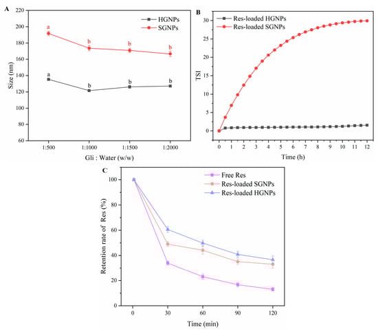 (A) The particle size of HGNPs and SGNPs at different weight ratios of gliadin to water The same sample with different letters indicate significant differences (p < 0.05).; (B) the Turbiscan Stability Index (TSI) of resveratrol-loaded hollow gliadin nanoparticles (Res-loaded HGNPs) and solid gliadin nanoparticles (Res-loaded SGNPs); (C) the retention rate (%) of free Res, Res-loaded HGNPs and Res-loaded SGNPs after ultraviolet light irradiation.