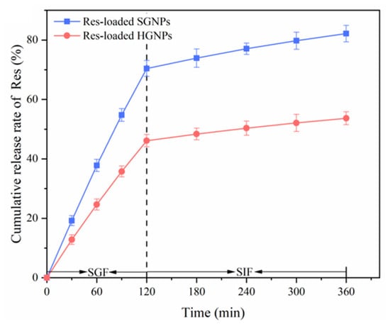 The release profiles of Res loaded in HGNPs and SGNPs in the simulated gastrointestinal tract were depicted in Figure 5. For both HGNPs and SGNPs, Res exhibited a rapid release in the simulated gastric fluid (SGF), which could be attributed to the swelling and partial breakdown of Gli nanoparticles in an acidic environment. After digestion in SGF for 2 h, 46.1% of Res loaded in HGNPs were released into the medium, compared to 70.4% of Res released from SGNPs. The main reason for this discrepancy was that Res adsorbed on the surface of SGNPs was rapidly shed and released into the SGF, whereas Res trapped in the hollow core of HGNPs was released when HGNPs were swelled and decomposed in an acidic environment. The result demonstrated that the HGNPs manifested a stronger protective effect compared to SGNPs in inhibiting the premature release of Res in the simulated gastric stage. In the simulated intestinal fluid (SIF), the release rate of Res was remarkably reduced due to the mild environment of the intestine. At the end of SIF, the cumulative release rate of Res from SGNPs and HGNPs reached 82.1% and 53.6%, respectively. The release rate of Res loaded in HGNPs was slower than that loaded in SGNPs, which indicated that HGNPs could postpone the release of Res and exhibited a better sustained-release effect during the simulated intestinal period. According to the report, Res was primarily metabolized in the liver and intestine via enterohepatic circulation [32]. Therefore, reducing the release of Res in the stomach and prolonging the release of Res in the intestine were conducive to improving the bioavailability of Res. A similar phenomenon was found that curcumin-loaded kafirin hollow nanoparticles prepared through the deposition of dextran sulfate/chitosan manifested a sustained-release of curcumin during the simulated gastrointestinal stage in comparison to solid nanoparticles [20].