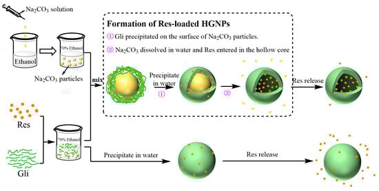 This difference in results could be explained by the structural difference between the two types of nanoparticles. The schematic illustration for the formation and release mechanism of Res-loaded HGNPs and Res-loaded SGNPs was shown in Figure 6. The formation progress of Res-loaded HGNPs can be divided into two steps: (i) Gli is deposited on the surface of Na2CO3 particles due to anti-solvent precipitation, forming the Gli shell; (ii) when water diffuses into the core, the original Na2CO3 core dissolves due to its good water solubility, while Res in the Gli shell enters the hollow cavity due to the hydrophobic effect, thus, forming Res-loaded HGNPs spontaneously. For HGNPs, Res was entrapped inside the hollow core of nanoparticles; while for SGNPs, Res was partially encapsulated inside the nanoparticles and partially adsorbed on the surface of nanoparticles. Therefore, Res loaded in SGNPs was more readily released during simulated digestion. This also suggested that the hollow structure of HGNPs was conducive to the sustained release of Res, thus, allowing more Res to be absorbed by the human body during the intestine and subsequent digestive stages.