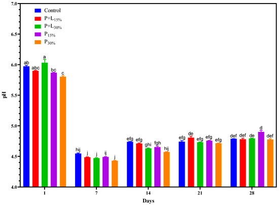 pH values during the processing of salamis that had undergone animal fat replacement with gels of psyllium fiber and combined linseed oil–psyllium fiber. Distinct letters demonstrate significant variations in Tukey’s analysis (p < 0.05). Error bars represent the standard error of the mean. Batches: Control: 20% pork back fat; P+L15% and P+L30%: 15% and 30% substitution of pork back fat with combined linseed oil–psyllium fiber gel, respectively; P15% and P30%: 15% and 30% substitution of pork back fat with gel of psyllium fiber, respectively.